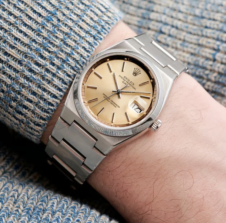 The look of the Oysterquartz was revolutionary for the brand, with a tonneau-shaped case and integrated bracelet. As we know from Rolex, the brand produced many different variations in different materials and with different dials and bezels. However, that case shape with the integrated bracelet was always the canvas for the different design variations. If we dive deeper into Rolex history, this specific look was introduced in 1975, two years before the Oysterquartz. That’s when high quality Rolex fake watches released two Date models powered by automatic movements with references 1530 and 1630. However, these models were merely precursors to the far more important Oysterquartz, which was available from 1977 until 2003.