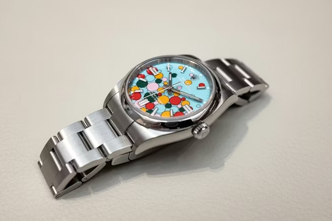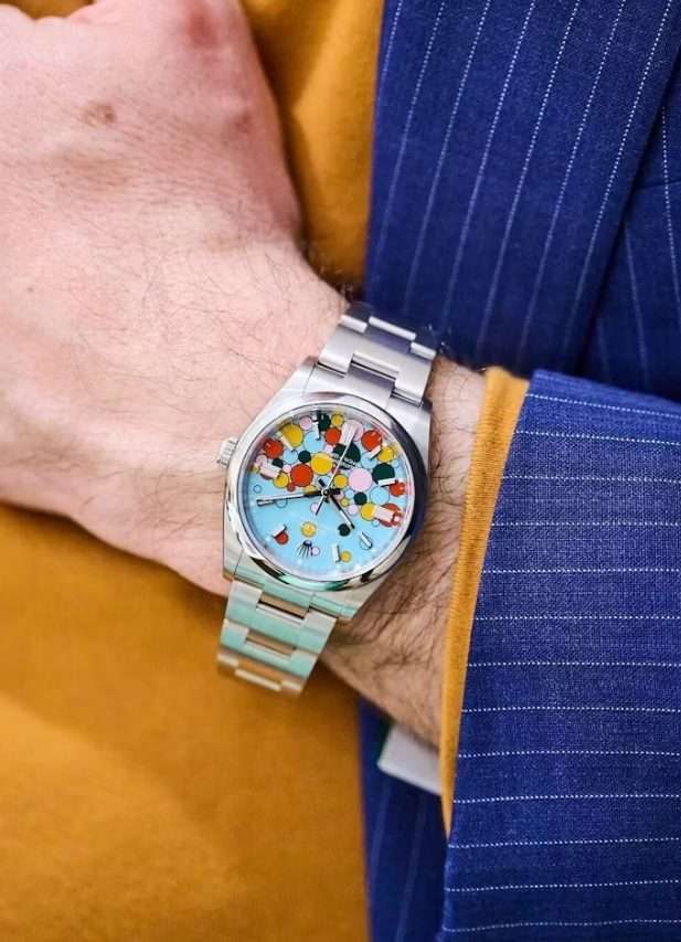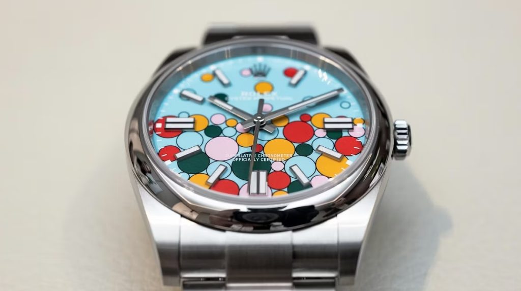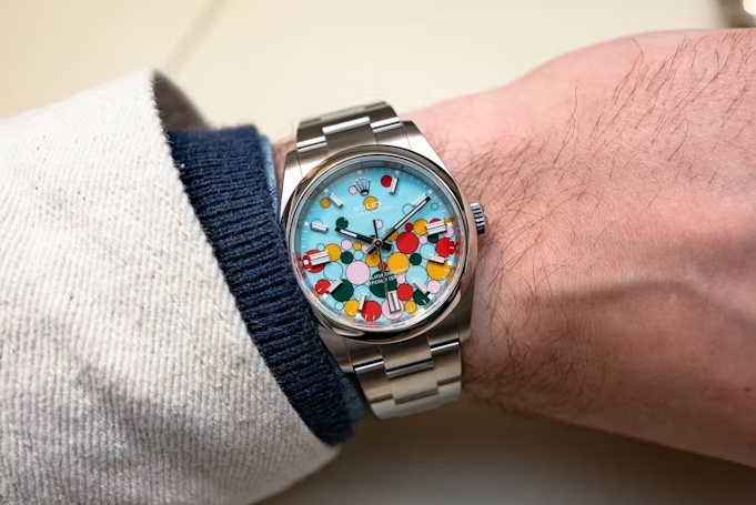 So what does Rolex do now that everyone has followed its lead? It jumbles those colors together in one “Celebration Dial,” with all five original hues atomized into 51 circular cells. The effect resembles a psychedelic bubble bath. Or a glass jar of tiny jawbreakers. I’ve even heard the look compared to a McDonald’s ball pit. The common thread among these analogies is that all of these things are fun. And fun – giddy, childlike fun – is what you will have if you are lucky enough to snap this $6,000 toy onto your wrist, which I did a few hours after it was released, grinning like a lunatic until a nice lady from AAA Rolex replica watches basically had to pry it off me.